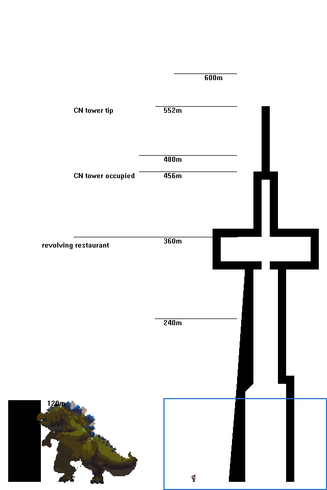 I read that Godzilla was ten stories tall so I’ve scaled to ten stories or tiles. Unfortunately, I think this must have been the original in 1954. Got 120m from the height of the recent Godzilla and I combined those together mistakenly to come up with 10 tiles=120m. Once I settled on that I wanted to compare it to the height of the CN Tower. It’s all kind of nonsense, but I can try to be at least a little consistent.